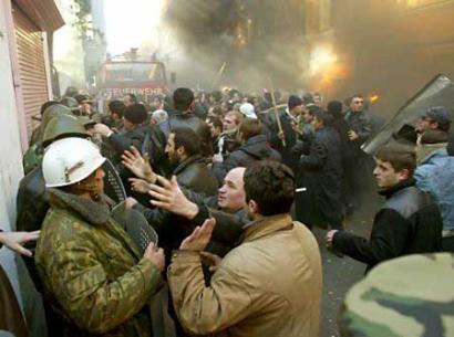 在成功控制格魯吉亞議會大廈后,格魯吉亞反對派又包圍了總統府。圖為格魯吉亞反對派與總統府外的警察發生沖突。(人民網圖)