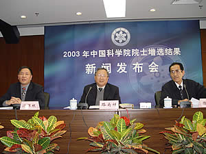 中國科學院院長路甬祥介紹說,根據《中國科學院院士章程》的規定,中國科學院院士增選每兩年進行一次,2003年增選名額為60名。經國務院有關部委、直屬機構,中國人民解放軍四總部,各省、自治區、直轄市和中國科協等歸口初選部門的推薦和院士推薦,共產生有效候選人309名。院士們經過充分討論、全面評審,最終選舉產生了58名新院士,其中數學物理學部10名,化學部10名,生物學部11名,地學部10名,技術科學部17名。