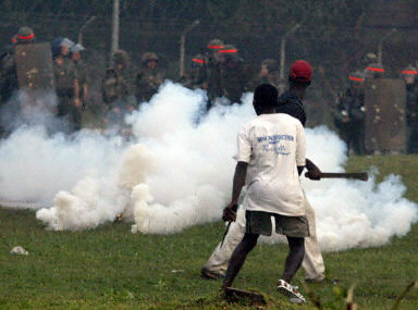 法國軍隊開始向示威人群發射擊催淚彈和震撼手雷,但更多的示威者仍源源不斷地向法軍基地開來,并且分批分撥地向法國軍事基地發動攻擊。法軍發言人向路透社記者證實說:“看樣子示威增援人員已經開到了。”這些抗議者開始用石頭猛砸法軍基地,在基地入口焚燒輪胎,科特迪瓦的準軍事部隊也趕到基地附近,但沒有干預抗議者的做法。