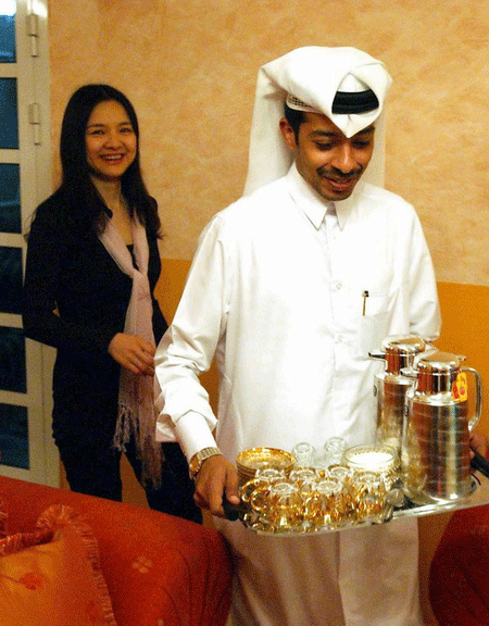 在倒數第二站阿聯酋迪拜,諸宸發現自己無論在哪里,都是人們注目的核心,男人女人都用奇怪的眼光看著這位露頭露臉的東方女子。而在從迪拜到多哈的飛機上,鄰座的阿拉伯小伙子竟然連看都不敢看她一眼。即將到達多哈時,諸宸向舷窗外看去,驚訝地發現在飛機一側竟然有大片的綠色,諸宸感到仿佛置身于《一千零一夜》的神話中。直到身穿長袍的穆罕默德出現在迎接的人群中,諸宸才真正地從虛幻的不真實感中解脫出來。