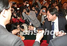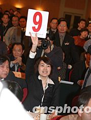 十二月八日,號稱“京城第一拍”的北京市首次大宗國有土地使用權拍賣會在國際飯店舉行。拍賣從四點三億元起拍,最終天津順馳集團以九億零五百萬人民幣買得北京大興區黃村衛星城黃金地段1號地區。圖為天津順馳集團向來賓們敬酒,喜慶竟拍成功。中新社記者:史利