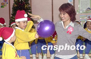 歌星梁詠琪12月8日在香港出席仁濟醫院郭子梁幼兒中心探訪活動,“仁濟慈善大使”梁詠琪與該中心小朋友一起唱游,并帶備圣誕禮物派發。作者:鄧慶樂