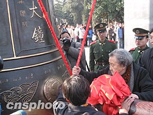 十三日,江蘇省暨南京市各界人士,以及部分國外友好團(tuán)體的代表、友好人士、港臺(tái)愛國同胞共3000余人,在侵華日軍南京大屠殺遇難同胞紀(jì)念館隆重悼念南京大屠殺30萬同胞遇難66周年,并舉行了南京國際和平集會(huì)。圖為南京大屠殺幸存者李秀英、夏淑琴撞響和平大鐘。作者:丁東升