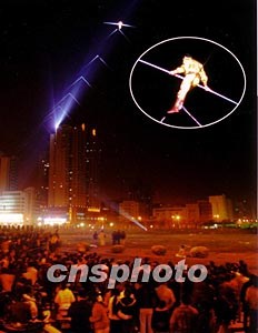 十二月十八日夜晚,被譽(yù)為“高空王子”的阿迪力在廣東汕頭上空成功走過一根四百二十六米長的鋼索。作者:杜一方
