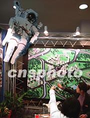 十二月中旬正在北京舉行的冬季房展會上,一家房地產開發商請來“太空人”模型為樓盤促銷。作者:張雷