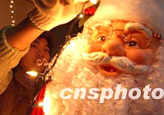 一名北京青年民工十二月底為商家裝飾圣誕老人燈光,迎接圣誕節紅火大促銷。中新社記者:賈國榮