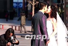 十二月二十二日,一對(duì)衣著單薄的新郎新娘在王府井街頭拍攝婚紗照。時(shí)值農(nóng)歷冬至日,隆冬的北京卻迎來暖融融的一天,白天最高溫度達(dá)到十?dāng)z氏度。中新社記者:張煒