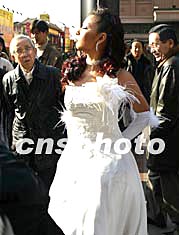 十二月二十三日,北京氣溫繼續回升,白天最高溫度高達十四攝氏度。一名身著露肩裝的模特在街頭作秀,吸引不少行人駐足觀看。中新社記者:鄭萍萍