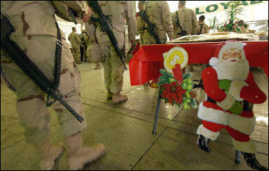 中新網12月25日電 據法新社報道,在圣誕夜,部分駐伊美軍在提克里特薩達姆的一處行宮舉行了圣誕午夜彌撒。美兵們合唱了贊美歌并品嘗了圣誕大餐。