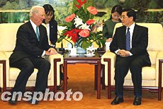 中新網12月29日電 據中國外交部消息,2003年12月29日下午,中國國家主席胡錦濤在人民大會堂會見了美國總統特使、前國務卿貝克。賓主進行了友好的談話。