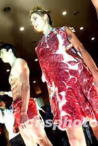 二十九日晚在北京舉行的NE.TIGER時尚峰會上,模特展示一款別開生面的“牛肉裝”,設計者將牛肉演化為天然面料,制成薄薄的長裙,使動物的物質本身創造性地體現了人的奇異視覺美感。中新社記者:毛建軍