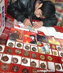 元旦期間湖南韶山的旅游商品攤點上,攤主忙著為游客在仿制的毛澤東像章上刻名留念。新年假期,參觀毛澤東故鄉的游客劇增。中新社記者:宋吉河