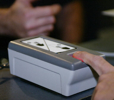 2004年1月5日,在洛杉磯國際機場,美國海關及邊境安全部門的官員展示新的指紋識別及拍照系統。從5日起,美國全境將推廣使用該系統,對進入美國的外國游客進行身份識別。
