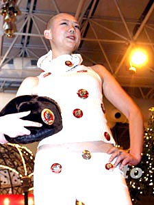 新春佳節(jié)即將來(lái)臨,各種聯(lián)誼活動(dòng)不斷推新,一位光頭模特在聯(lián)誼會(huì)上披掛毛主席像章上臺(tái)表演。中新社記者:史利