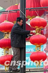 中國農(nóng)歷新年即將來臨,一名工人正在北京街頭安裝大紅燈籠。新春佳節(jié)臨近,北京的新年氣氛越來越濃。中新社記者:張煒
