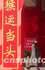 中國傳統農歷猴年來臨之際,一家大型商場打出“猴運當頭”(諧音“鴻運當頭”)的賀歲標語。隨著春節臨近,北京街頭大紅燈籠和賀歲標語比比皆是。中新社記者:張煒