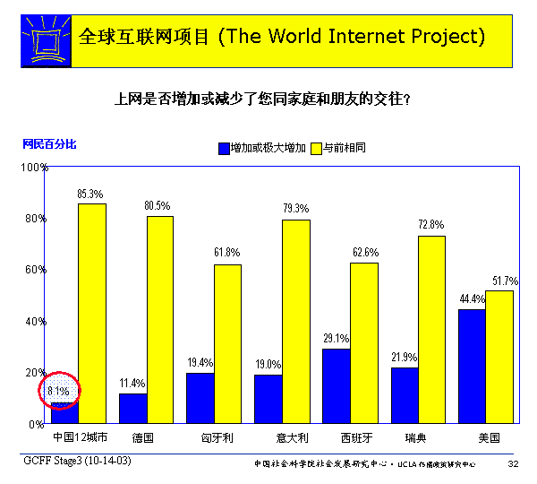 中國只有少量被訪網民認為上網增加了他們同家庭和朋友之間的交往,很可能是因為中國人更加看重親友之間面對面的直接交往。