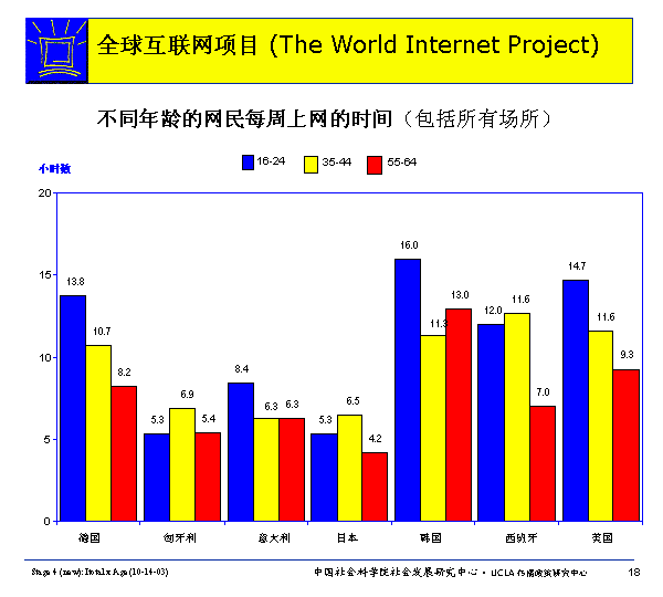 除幾個明顯的例外:匈牙利、西班牙和日本,年輕的網民比年老網民的平均上網時間更長。