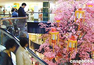 香港太古城裝飾新年裝飾,巨大的桃花樹上懸掛宮燈,營造節(jié)日氣氛。作者:洪少葵