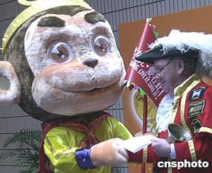 一月十九日在香港舉行的“2004國泰航空新春國際匯演”發(fā)布會(huì)上,猴年吉祥物“美猴王”在會(huì)上熱烈歡迎參加匯演的各國表演隊(duì)。作者:錢興強(qiáng)