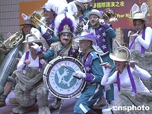為迎接中國農(nóng)歷新年的到來,香港舉辦“2004國泰航空新春國際匯演”,在一月十九日舉行的發(fā)布會(huì)上,來自澳洲“手舞足蹈活力樂隊(duì)”進(jìn)行表演。