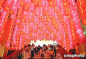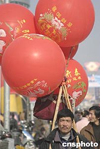 春節(jié)臨近,江蘇走街串巷的貨郎趁著年關人們購置年貨的機會,扛著高高的氣球穿行于街道,等待著買賣的到來。中新社記者:高遠