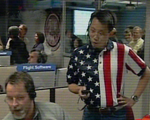 美國國家宇航局噴氣推進實驗室的火星著陸系統(tǒng)總工程師、華裔科學家李煒鈞(Wayne Lee,站立者)與同事緊張指揮調(diào)度。