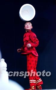 一名十歲的山西兒童春節期間在北京廟會上從容表演雜技“頂壇”。據悉,在中國民間有許多孩子從五歲左右開始習練雜技藝術,小小年紀便已身懷“絕技”。中新社記者:王麗南