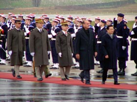中國國家主席胡錦濤乘專機于巴黎時間下午兩點四十分抵達巴黎奧利機場,開始對法國進行國事訪問,法國總統希拉克夫婦親自到機場迎接。圖為胡錦濤在希拉克陪同下,檢閱法國三軍儀仗隊。