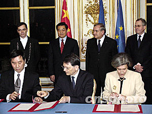 中新網巴黎1月28日電(記者蔚中)二十八日晚,巴黎馬提翁宮——法國總理府內燈火通明,中、法兩國在此簽訂了九項合作協議。正在法國訪問的中國國家主席胡錦濤和法國總理拉法蘭出席了簽字儀式。