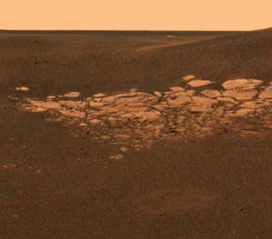 1月28日美國宇航局公布了利用“機遇”號火星車發回的數據合成的照片。這張高清晰度的火星照片清晰地記錄了裸露在火星地表的巖床!皺C遇”號預計將在下周鉆出著陸艙,開始火星漫步探測。