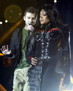 星期天晚上,珍妮穿一款黑色緊身皮裝,和搭檔賈斯廷在美式橄欖球超級杯大賽中場載歌載舞。歌曲臨近結(jié)束時,只見賈斯廷的手從容地伸到珍妮胸前,用力一扯。珍妮的緊身胸衣就象被“嘭”地炸掉一扇門似的,給扯掉一層。她飽滿的右胸不偏不倚、沒遮沒擋地露在觀眾面前。