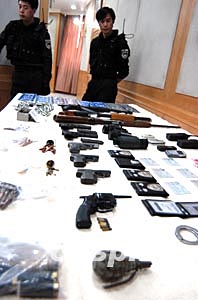二月十三日,北京警方舉行新聞發布會,通報綁架中央實驗話劇院演員吳若甫的詳細案情,并展示以王立華為首的持槍綁架殺人犯罪團伙的作案工具。中新社記者:任海霞