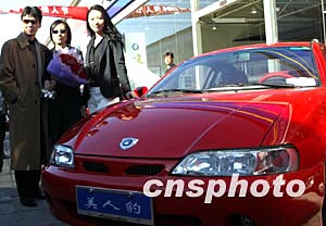 二月十四日是西方情人節,中國吉利集團北京經銷店分別向前來提取紅色美人豹跑車的五對情侶、夫婦贈送了99朵紅玫瑰,以示節日的祝福,2003年環球中國小姐吳薇(右)也來現場助興。中新社記者:趙振清