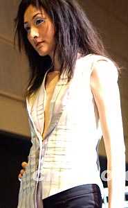 “2004香港教育及職業(yè)博覽會”二月十九日在香港會展中心開幕,圖為在香港職業(yè)訓(xùn)練局工商信息學(xué)院展臺上,模特展示該院學(xué)生創(chuàng)作的服飾作品。作者:錢興強(qiáng)