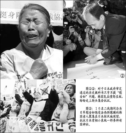 日本文部省2002年4月9日審定通過《最新日本史》教科書,這本由極端民主主義者編纂,于2003年8月開始在高中歷史課教學(xué)中實(shí)施的歷史教科書,對日本侵略者的暴行及強(qiáng)迫包括韓國婦女在內(nèi)的廣大亞洲婦女充當(dāng)日本侵略軍“慰安婦”的暴行避而不提。因此,《最新日本史》一經(jīng)出臺,立即引起了韓國各方的嚴(yán)重抗議。