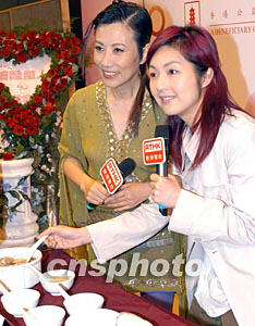 藝人汪明荃2月25日在香港電臺出席由香港電臺及香港防癌會合辦的《汪明荃愛心演唱會》記者會,歌星楊千嬅特別送上補湯向“阿姐”汪明荃打氣。
