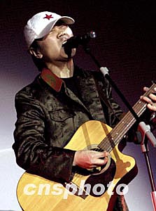 三月五日晚,德國“搖滾教父”林登貝格和中國“搖滾教父”崔健在北京展覽館劇場聯袂出演多媒體音樂劇《大西洋故事》。圖為崔健自彈自唱搖滾歌迷耳熟能詳的經典歌曲。作者:高遠