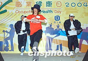 歌星何韻詩3月6日在香港出席由職安局及勞工處舉辦之《職安健康日2004》開幕典禮活動,「職安領隊」何韻詩帶領出席嘉賓及歌星進行健康操,宣揚職業安全信息。作者:鄧慶樂