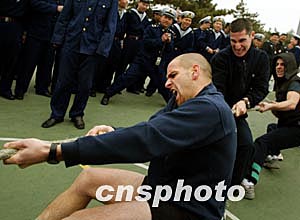 圖:參加中法青島軍事演習官兵舉行拔河比賽