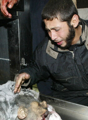 在加沙城的示法醫院里見到亞辛尸體,一位巴勒斯坦人失聲痛哭