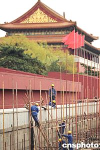 翻建工程擬于明天開工,今年十月一日前竣工。官方希望,天安門觀禮臺以“嶄新面貌”迎接國慶五十五周年。