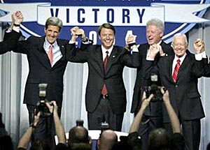 中新網3月26日電 據美聯社報道,民主黨人25日熱烈歡迎克里成為他們新的領導人,美國前總統克林頓、卡特、克里的競選對手和前敵手都出席了克里的慶祝晚宴。競選對手和前敵手們都表示,他們將把分歧放在一邊,與克里團結合作以便在選舉中擊敗布什總統。