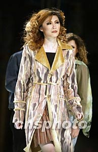2004年—2005年秋冬流行趨勢主導品牌“威鵬”牛仔裝發布會三月三十日在北京國際時裝周亮相,模特展示面料講究、款式新穎的系列牛仔裝。中新社記者:毛建軍