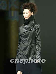主題為“性情暢流、城市輪廓、快樂狂想”的2004—2005年波斯登秋冬防寒服流行趨勢發布會,三月三十日在北京國際時裝周閃亮登場。圖為世界小姐季軍獲得者關琦身著一襲黑色防寒服出場亮相。中新社記者:毛建軍