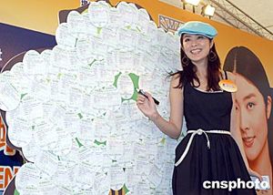 歌星陳慧琳4月10日在香港出席《職業英語2004陳慧琳英語工場Fun Fun Show》,并于復活節“許愿樹”貼上祝福愿望。陳慧琳為職業英語運動宣傳大使。作者:鄧慶樂
