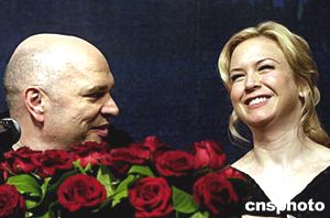 四月十二日下午,剛剛獲得奧斯卡最佳女配角的美國著名影星蕾尼·齊薇格攜影片《冷山》來華。該影片將于四月三十日在中國上映。圖為蕾尼·齊薇格(右)與影片導演、英國著名導演安東尼·明格拉(左)在媒體見面會現場。作者:高遠