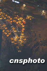 今晨,重慶天原化工廠發生氯氣泄漏事件,重慶市政府緊急疏散上萬當地群眾。圖為重慶市政府緊急調集的車輛正在往安全地帶輸送群眾。作者:郭晉嘉  重慶市政府在離事發地兩公里的地方拉起的警戒線外圍觀的群眾。作者:郭晉嘉