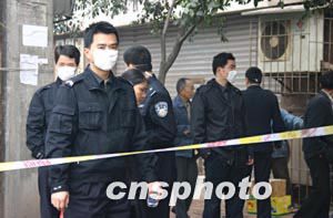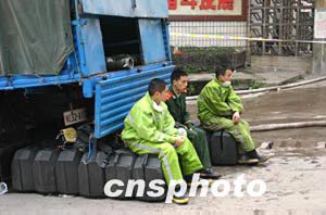 四月十七日,武警戰士在重慶天原化工總廠外嚴陣以待。十五日晚,重慶市天原化工總廠發生氯氣泄漏事故,有十五萬人撤離.作者:鄒輝