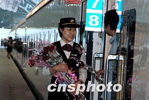 十七日晚,中國鐵路第五次提速開始,經過培訓的乘務員為每一位上車旅客送上鮮花。新開行的十九對直達特快列車中,北京開往杭州的Z9次首先發車。